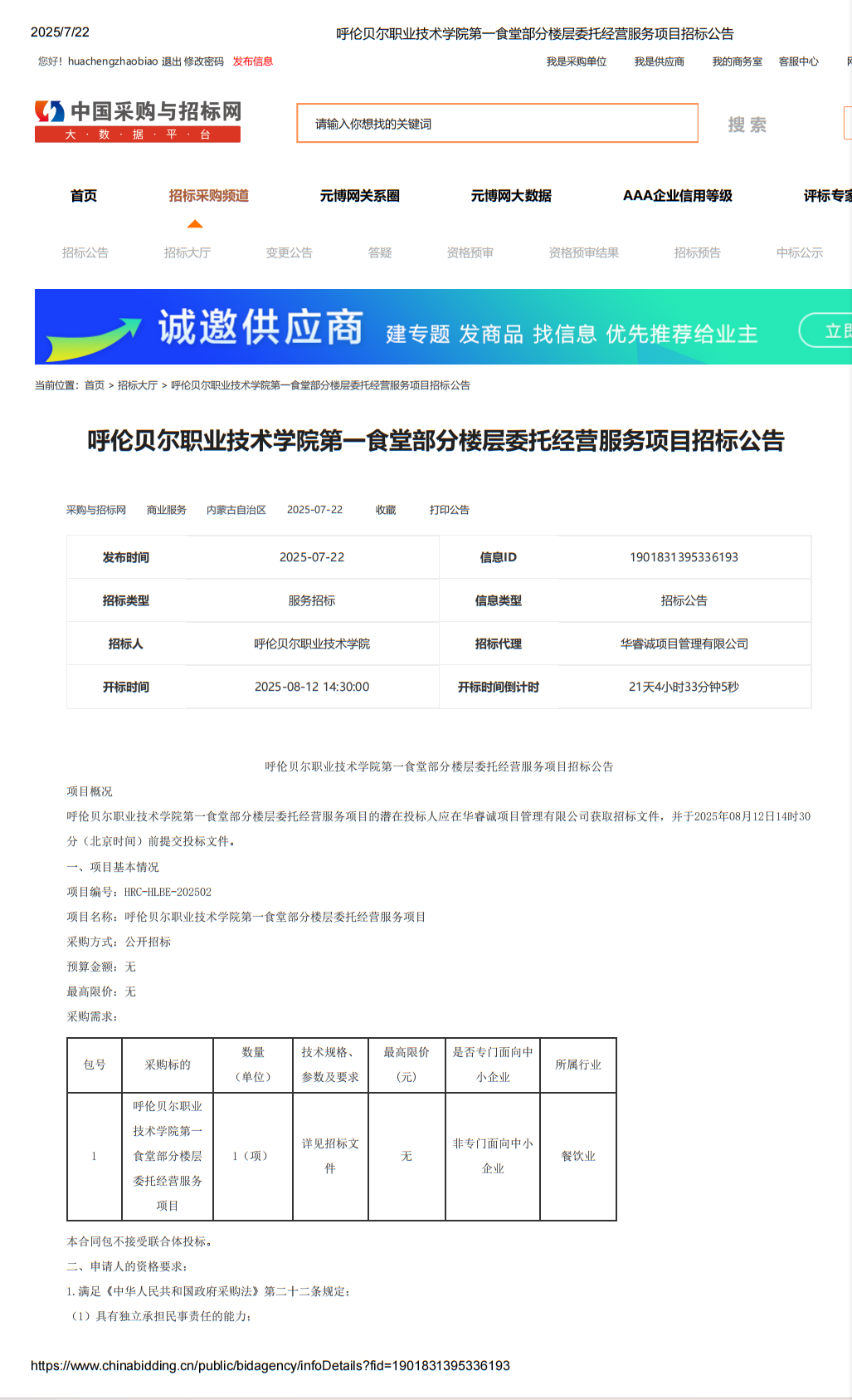 呼伦贝尔职业技术学院第一食堂部分楼层委托经营服务项目招标公告