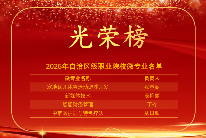近日,内蒙古自治区教育厅发布“关于2025年自治区级职业院校特色专业、微专业认定结果的公示”,我院护理、学前教育、计算机应用技术三个专业被认定为自治区级职业院校特色专业;寒地幼儿冰雪运动游戏开发、新媒体技术、智能财务管理、中蒙医护理与特色疗法被认定为自治区级职业院校微专业。截至目前,学院已拥有5个自治区级特色专业,4个自治区级微专业,专业建设再上新台阶。