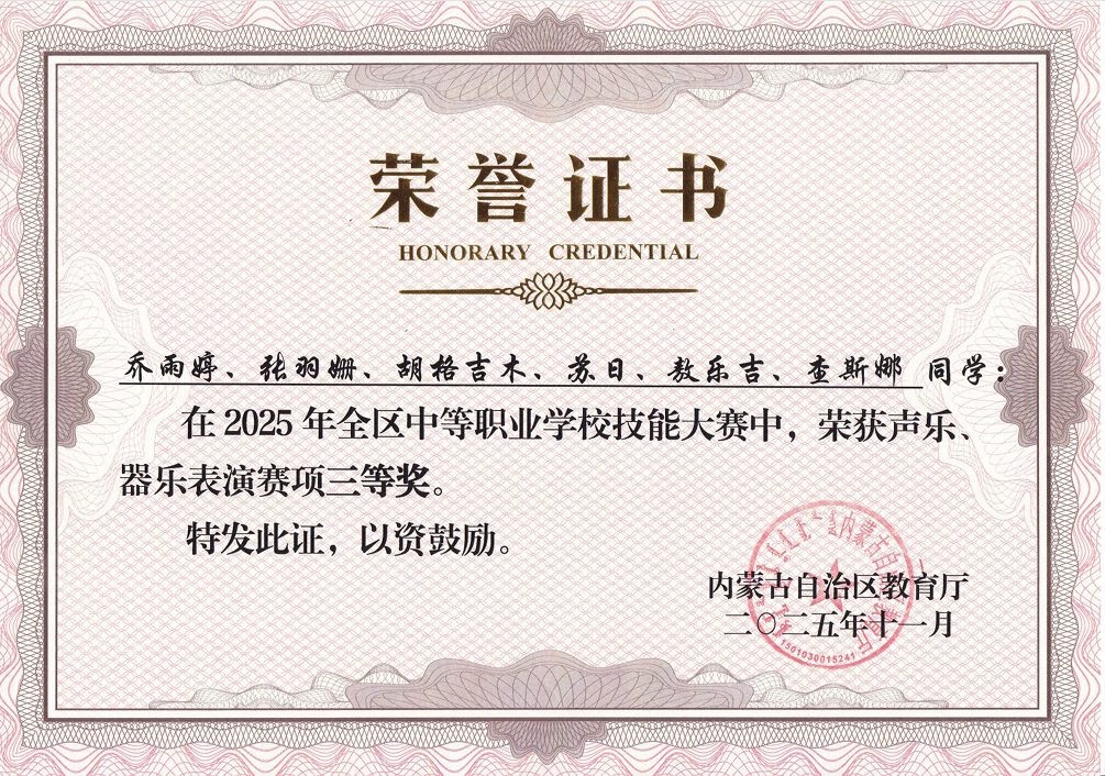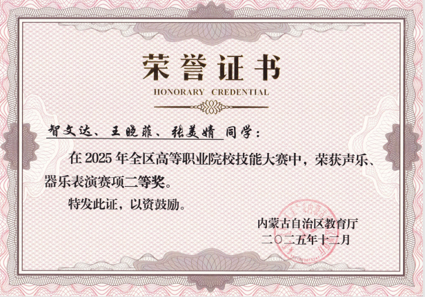 在高等职业院校组比赛中,2024级大专音乐表演班智文达、王晓菲、张美情三位同学凭借出色的表现,荣获声乐器乐表演赛项二等奖(指导教师:马海江、裴晓红)。与此同时,在中等职业学校组比赛中,2024级中专音乐表演班乔雨婷、张羽姗、胡格吉木、苏日、2025级中专音乐表演班敖乐吉、查斯娜六位同学团结协作、发挥稳定,荣获该赛项三等奖(指导教师:马海江、南斯拉玛)。